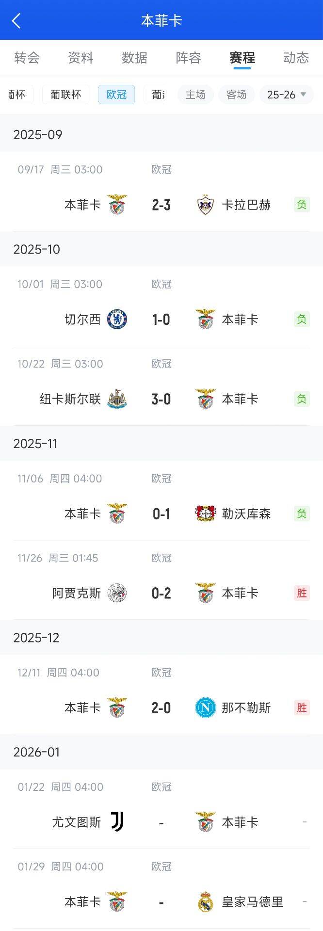 12月11日讯 欧冠联赛阶段第6轮,本菲卡2-0击败那不勒斯,积6分暂列欧冠第25位,距离附加区仅1名。