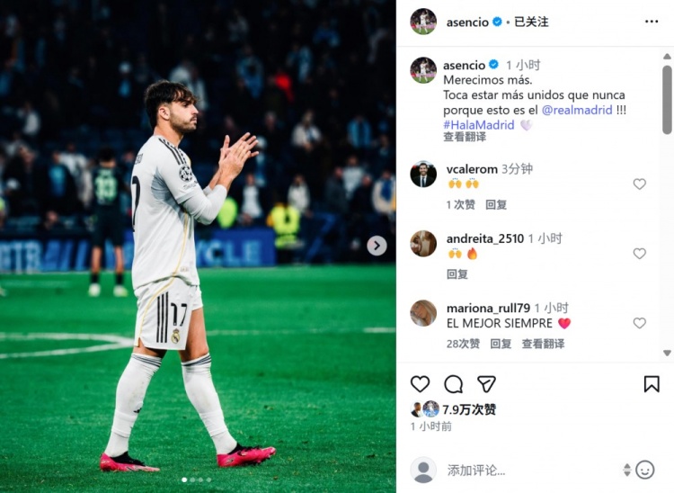 本场比赛阿森西奥首发出场,赛后他也在社媒晒出本场照片,配文鼓励球队写道:“我们配得上更多!此刻我们需要比以往更加团结,因为我们是皇马!”